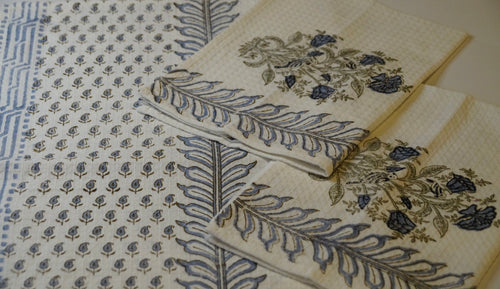 Kitchen and dining textiles including table cloths, placemats, table runners, napkins, kitchen towels, and aprons, designed for everyday use and relaxed gatherings.